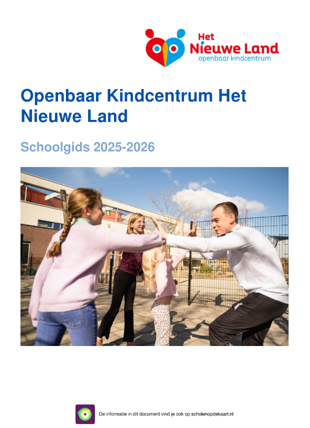 Openbaar Kindcentrum Het Nieuwe Land is een fijne en veilige plek, waar elk kind een wereld te ontdekken heeft. Een plek waar we vreedzaam met elkaar omgaan en waar iedereen evenveel waard is. Hier bieden wij goed onderwijs en opvang aan onder één dak voor kinderen van 0 tot 13 jaar. Dat doen we samen met Ska kinderopvang, partners in de stad en de inzet van betrokken ouders/verzorgers. Gaat jouw kind bij ons de toekomst aan.